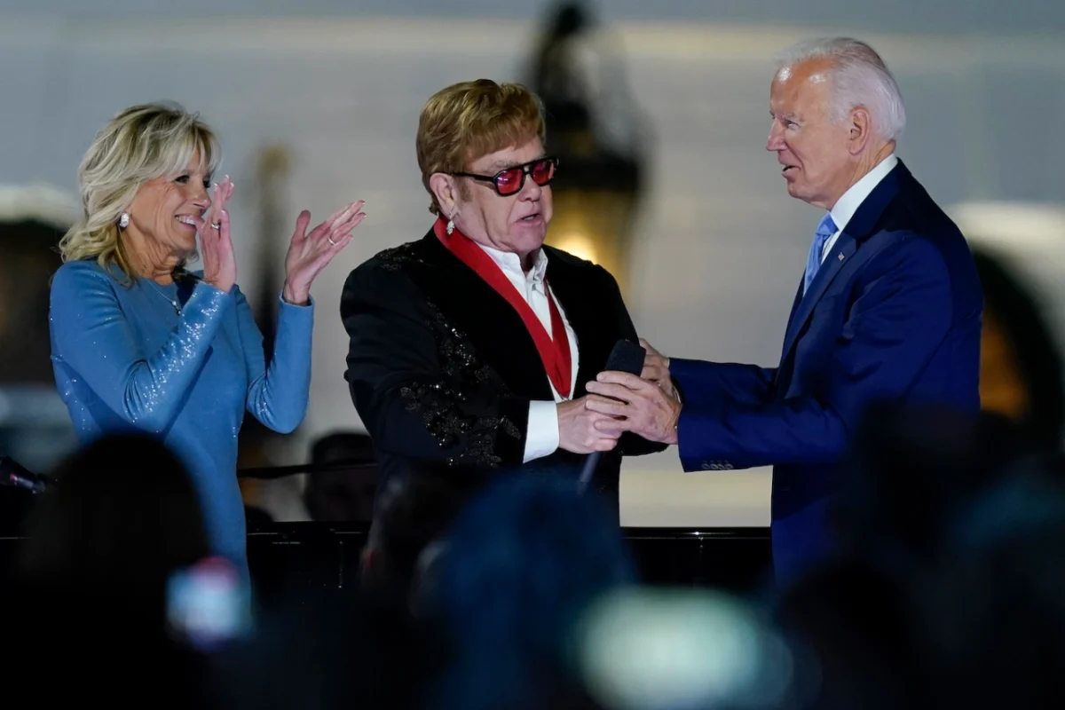After Elton John performed live on the White House South Lawn in “A Night When Hope and History Rhyme” concert he was presented with the National Humanities Medal by President and Dr. Biden. It was awarded in recognition of all the phenomenal work he has spearheaded in the fight against AIDS.