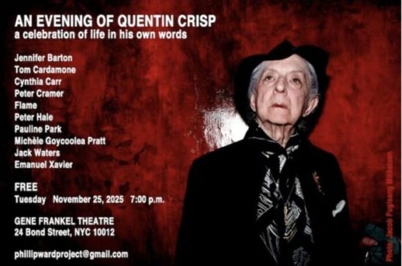 Thanks to Crisp’s Executor and former Personal Assistant Philip Ward, there are still readings of his work some 26 years later after his death. Such as the upcoming “An Evening of Quentin Crisp: A Celebration of Life in His Own Words” invites you to a night of celebration at the Gene Frankel Theatre to commemorate the legendary life of Quentin Crisp on the 26th anniversary of his passing. Special guests will read excerpts from Mr. Crisp’s books, two short films by filmmaker Adrian Goycoolea (Mr. Crisp’s great-nephew), Phillip Ward, and a rare screening of the Alternative Queen’s Message. His work is too good to be forgotten, even if some of his worst opinions cannot.