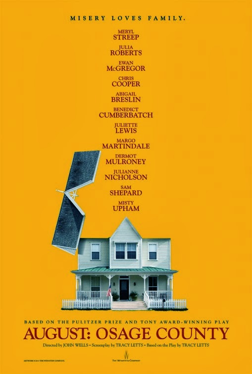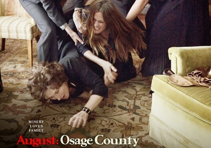 Violet Weston is one acid-tongue angry old lady who misses nothing that goes on in her family and she insures that none of her nearest and dearest escape her unbridled wrath. Well, her husband Beverley and alcoholic and rather melancholic poet does, but his method is quite extreme as he disappears out of the blue, and then the police locate his body after he has taken his own life.His funeral is the reason that the entire dysfunctional family have turned up in this large rambling house set in the plains of Oklahoma in the fierce summer heat. Violet has cancer and uses a hideous black wig to hide the results of the chemo treatment, but it is also her cover to indulge in her drug addiction. In fact there is a rarely a moment in this drama when she isn’t popping both pills and cigarettes in her mouth, even at meal times.