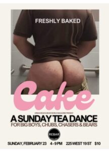 BIG ‘N TASTY Chubs, Chunks, Chasers & Bears—This one’s for you! Finally, a Sunday afternoon mixer and dance party created especially for THE BIG BOYS (and those who love them). Join Bear World Magazine & Urban Bear for the launch of CAKE @ REBAR in Chelsea on Sunday, February 23 from 4-9pm. REBAR 225 West 19 St. / $10 at the door |
