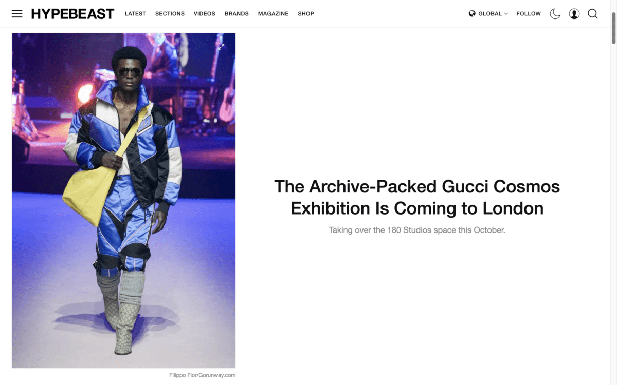 This is stop #2 on the traveling exhibition’s tour, having debuted to great success in Shanghai (and moving on to Paris and Kyoto next). However, it won’t be a carbon copy – the idea is for show the show to morph slightly to reflect the host city. And London’s Gucci Cosmos should be a particularly poignant one because it’s here that the brand has its roots: founder Guccio Gucci first found sartorial inspiration handling luxury luggage while working as a porter at The Savoy.