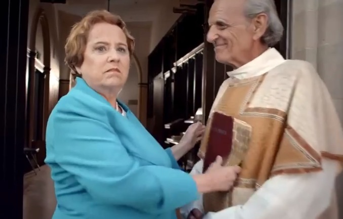 Panic not as the bible-clutching matron on the steps of the church who is so-offended at the arrival of a gay couple who are about to get married that she stops them going any further as she shouts out ‘How Offensive!’ As the men start to get outraged she explains that the ‘blemish’ on the sanctity of marriage that she is so offended by can actually be fixed. Just with the aid of a Tide To Go stick which will bleach out the stain on the groom’s shirt whoch is the real reason she is so upset. If only Kim Davis could be erased without a trace so easily!