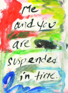 There was no preconceived notion of Wasteland, that title, made famous by T.S. Eliot did not yet exist for our project. We began with watercolor paper, ink, and a bamboo pen. I rifled through old journal entries dating back to 2021 and I found passages that still resonated with me. When I transcribed them onto the watercolor paper, I channeled the emotions I felt at the time those words were written. When I handed off the pages to Scooter, the aim was to discover a response. Nothing planned, nothing predetermined. And when he returned the pages, surrounded by his art, it didn’t change the meaning of my words; instead, it added a light and an energy to them, another pulse. Sometimes, I would give a response back, adding paint and pastels to his creation. And sometimes, I would write more words, over his art. This was the kind of collaboration I was looking for.
