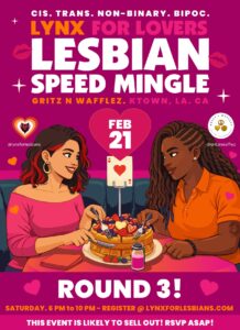However if you are in the LA area, then you could check them out for yourself. On Feb 18th they are holding Round 3 of a Speed Dating Event, which they say are intent on building sustainable and mutually empowering lesbian relationships: platonic, romantic, professional, and/or otherwise.