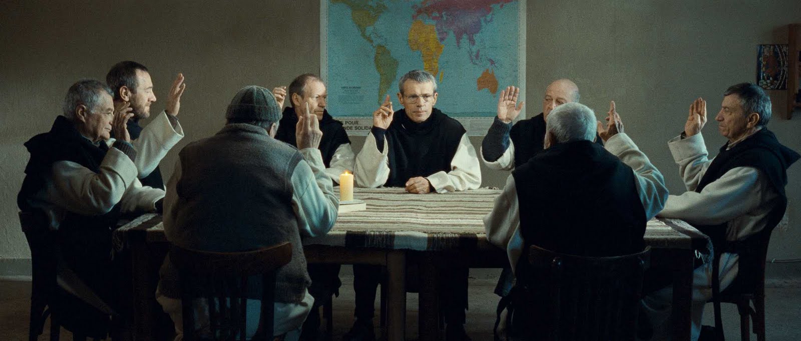 Whilst the tension mounts the Monks discuss their fears about their own safety and whether they should leave whilst they still can. Over the course of time their wavering disappears and is replaced by a resolve that they should follow their ‘calling’ as men of God. It’s a remarkable and emotional sequence of conversations that show all their natural fears for their lives and that underneath their monks habits, they are just men too. The culmination of their decision is shown in a exceptionally wonderful moving scene when they break open wine at their meal table and sit drinking it silently listening to Tchaikovsky’s Swan Lake and smiling serenely.