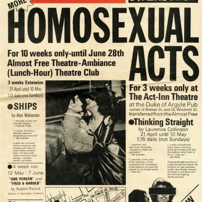 Radical Rediscovery: Homosexual Acts & Beyond, now there’s an intriguing event name! And it sounds great too. Marking the 50th anniversary of 1975’s Homosexual Acts, the first official Gay theatre season in Britain which took place at London’s Almost-Free Theatre, this is a new exhibition is set to interrogate and celebrate Lesbian and Gay theatre’s early years. The show comprises an array of posters, flyers, photos, magazines, props, set models, costumes, books, original footage and interviews with key participants.