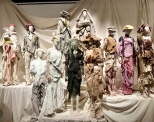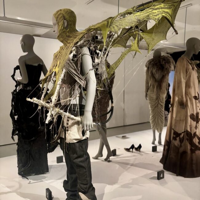 We then step back further with pieces from the AW 1982 Nostalgia of Mud collection by Vivienne Westwood and Malcolm McLaren. This collection wanted to explain how the roots of our culture lay in primitive societies. This work is shown alongside similarly inspired pieces by various other designers such as Issey Miyake and Alexander McQueen.