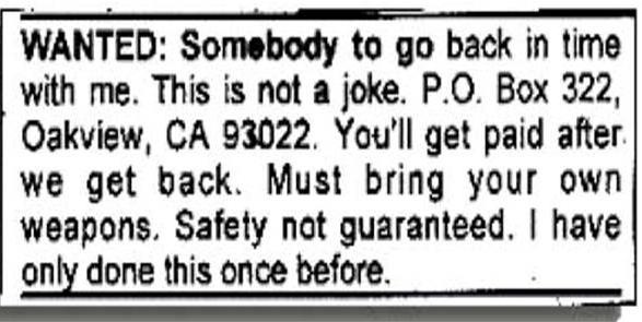 mentions an anonymous advert that he has spotted asking for a time-travelling