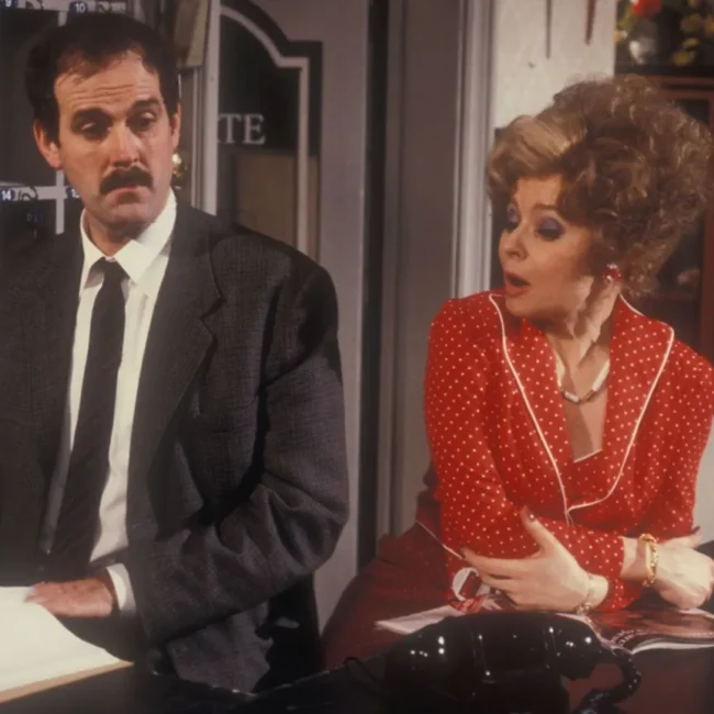It was, however, in 1975 that she won the hearts of the nation (and beyond) as Sybil Fawlty in John Cleese‘s truly wonderful sitcom Fawlty Towers. Sybil was a quick-witted, overpowering dragon, and although her husband 6′ 5″ Basil towered over her physically, she made him cower with her wicked tongue. One single word that she screamed at him constantly….’Basil…. soon became a national catchphrase. We loved her also when she dropped all the anger when she was gossiping on the phone to some unknown friend and would screech “Oh, I knoooooow!”,