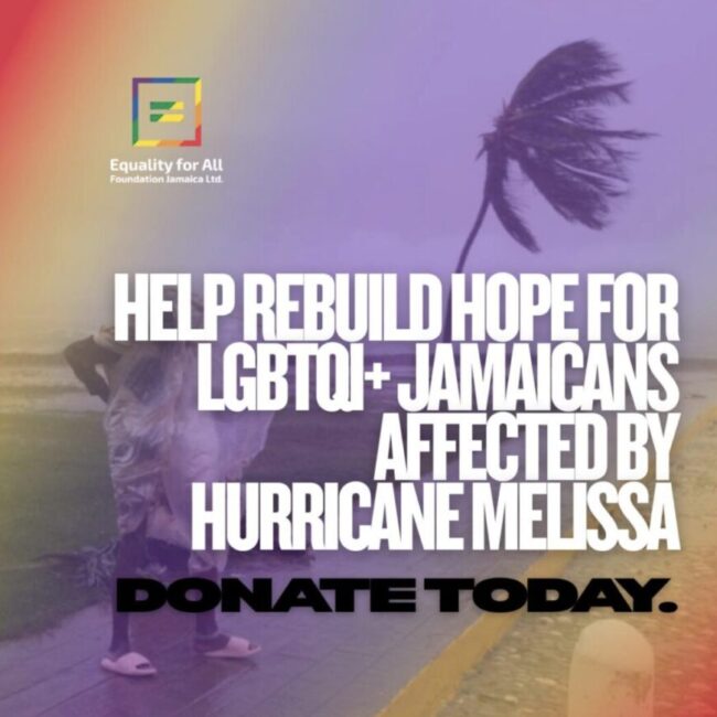 Equality for All Foundation Jamaica, a Jamaican LGBTQ rights group, is raising funds to help victims of Hurricane Melissa. It is doing this through the Rustin Fund for Global Equality and will “provide emergency housing, transportation, essentials, and rebuilding support for those in our community most in need.”