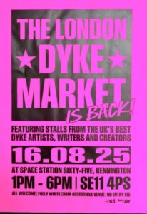 Witham told Nonchalant Magazine I launched The London Dyke Market as I was frustrated with the lack of spaces for dykes to showcase their work. My friends and members of my community around me were producing art, writing books, and creating remarkable things about contemporary lesbian culture, yet there were limited opportunities, beyond online platforms, to present these works to the very audiences they represented.