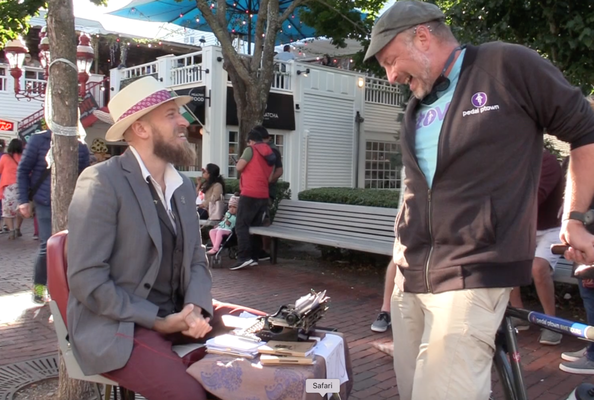 Kevin Devaney, Poet calls himself an itinerant poet with a typewriter penchant as he sits outside Provincetown Town Hall for most of the summer. Clutching a couple of college degrees in Poetry he is the real mccoy, something you will soon find out if you stop by his wee table and request some personal customised prose.