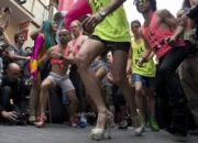 One of the highlights of World Pride in Madrid this past week had to have been the Men in High Heels Race. Just so it’s not too easy (as if) the organizers insist that the shoes have a minimum 4″ heel, but evidently there are no rules how you actually wear this potentially lethal footwear so many of the enterprising runners tape the shoes to their feet.